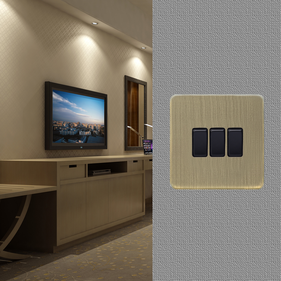 10 Amp 双控开关掣可接驳两个开关分别在两个位置控制一组输出 尺寸: 87.5mm(W) x 87.5mm(H) 备有不锈钢、仿银、仿金、黑镍、古铜、哑黑和哑白饰面选择 产品符合BS标准 产品已取得CE及RoHS认证 产品符合英国及欧盟标准