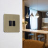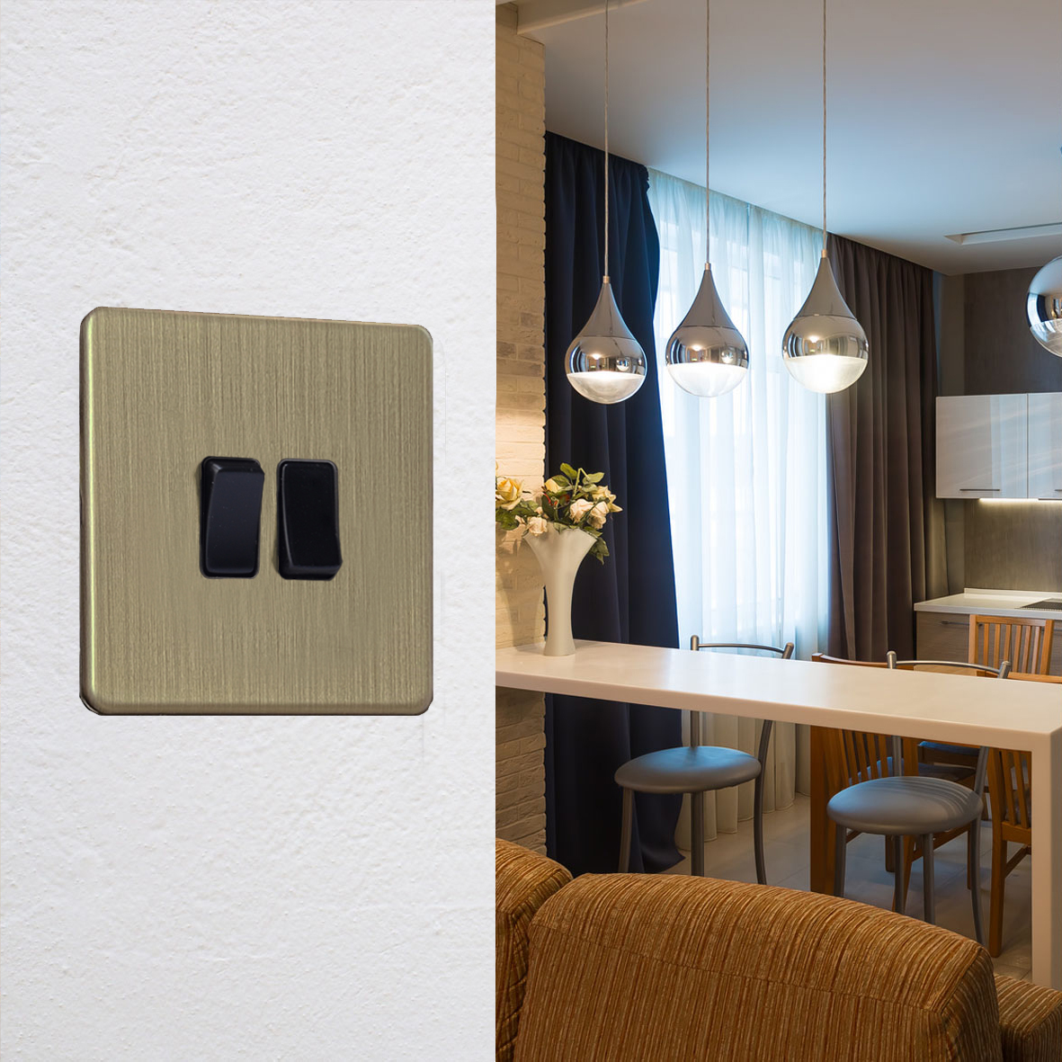 10 Amp 雙控開關掣可接駁兩個開關分別在兩個位置控制一組輸出 尺寸: 87.5mm(W) x 87.5mm(H) 备有不锈钢、仿银、仿金、黑镍、古铜、哑黑和哑白饰面选择 按照 BS 标准制造 CE 和 RoHS 认证 符合所有英国和欧盟法规