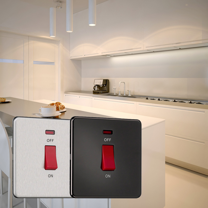 250V~45A 尺寸: 87.5mm(W) x 87.5mm(H) 备有不锈钢, 仿银, 黑镍, 哑黑, 仿金, 哑白饰面 产品符合BS标准 产品已取得CE及RoHS认证 产品符合英国及欧盟标准