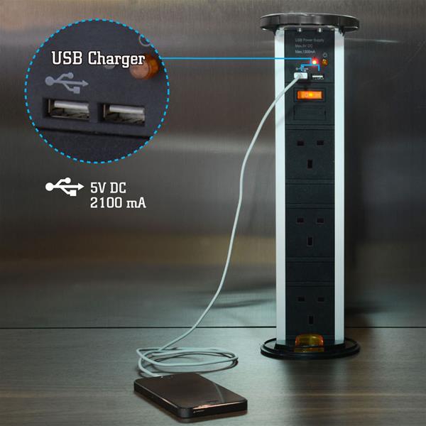 輸入:220V-240V~ 13A 英式插座 x 2 雙USB充電輸出:Max. DC 5.0V,2.4A,12.0W OVC III 黑鎳或砂鎳色金屬壓鑄頂蓋 IP54防水及防塵 符合BS,CE和RoHS標準 符合英國和歐盟的所有法規